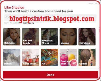 - Proses pembuatan akun hampir selesai, namun untuk mengakses akun pinterest kita diwajibkan untuk menentukan minimal lima kategori atau topic yang menarik minat kita. Caranya sangat simpel cukup klik topic yang berdasarkan anda menarik atau cocok dengan pasion teman-teman, asal juga boleh. Kemudian klik tombol done.